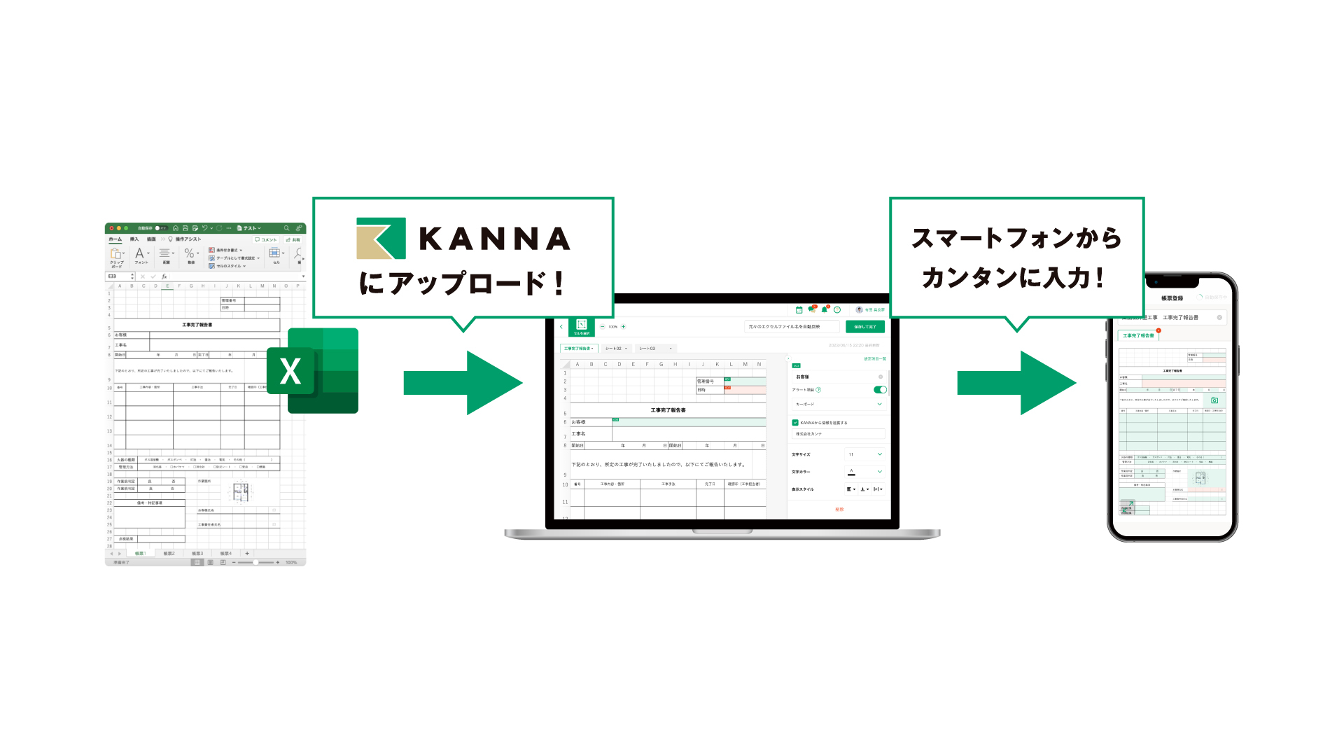 - Excel帳票のインポート機能: 使い慣れたExcelフォーマットをそのままKANNAに取り込みアプリ化。