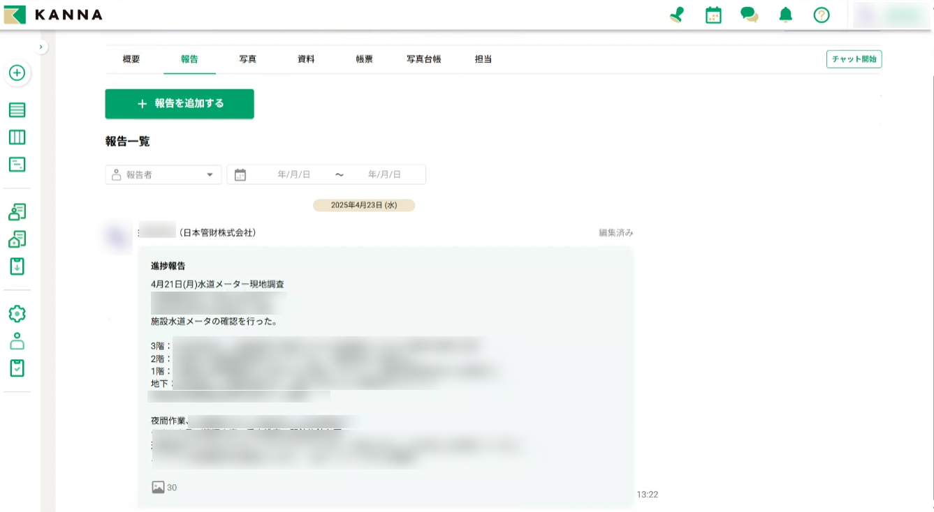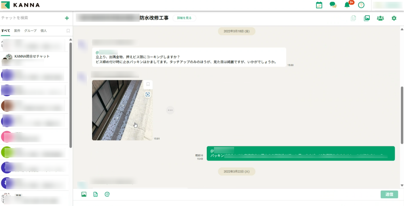 そこで同社はKANNAの導入を決断。コストの心配なく協力会社を招待できる料金体系と、直感的な操作性が決め手となりました。メールだった連絡手段はチャットに変わり、資料の共有もクラウドに一元化しました。協力会社の担当者でも、スマートフォンで撮影した写真をその場で共有できるため、管理者は遠隔からでもリアルタイムにその状況を把握し、的確な指示を出せるようになりました。