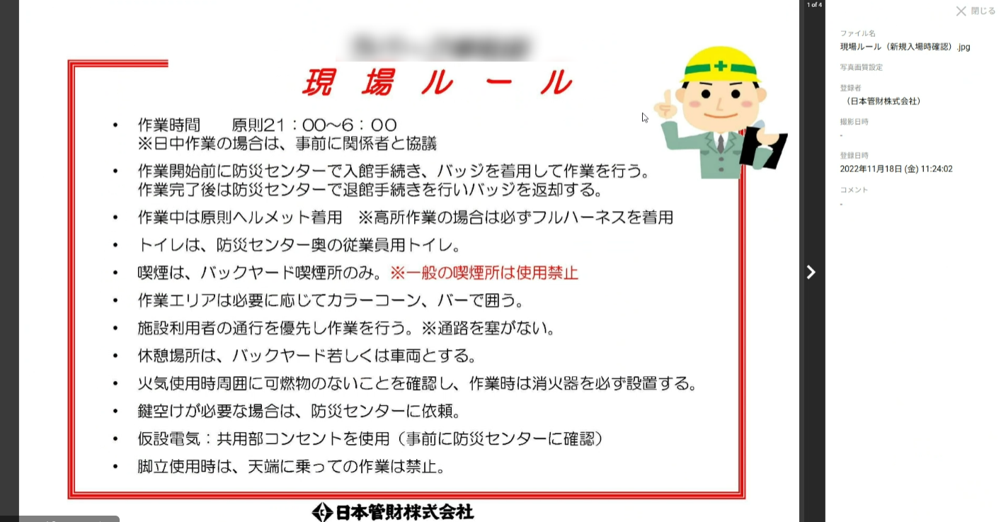 日本管財が作成している「現場ルール」。テンプレートをコピーし現場によって書き換え、jpgデータでKANNA内に格納している。登録日も一目でわかる
