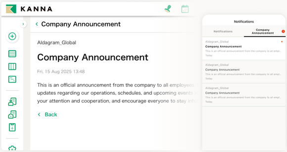 For each announcement, you can specify members from your own company or other companies registered in KANNA and deliver it to them.
