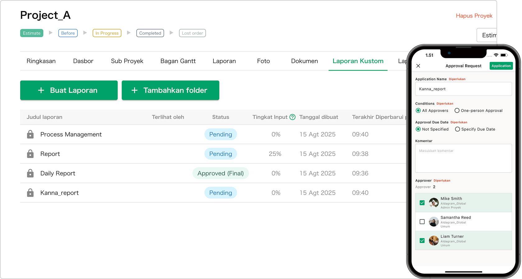 Sistem ini memungkinkan Anda untuk memvisualisasikan progress proyek yang berjalan secara bersamaan dan mengelola semuanya dalam satu platform terpusat.