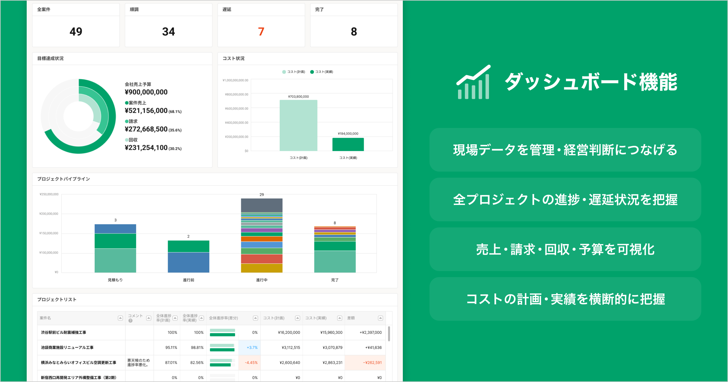 建設業、不動産業、製造業などのノンデスクワーク業界では、同時並行で進む数十〜数百の案件を管理するケースが一般化しています。経営層や管理職にとっては、全体の中でどの案件に遅れが生じているのか、またその背景にどのような要因があるのかを即座に把握することが難しく、全案件の売上見込みやコストの消化状況を横断的に確認できないという課題がありました。