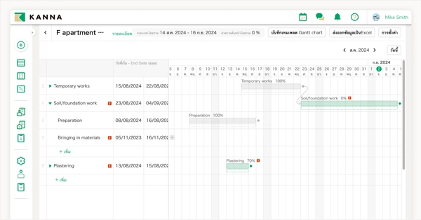 KANNA มาพร้อมฟังก์ชัน Gantt Chart ที่ช่วยแสดงแผนงานของโครงการในรูปแบบไทม์ไลน์ ทำให้เห็นลำดับงาน ระยะเวลาเริ่ม–สิ้นสุด และความเชื่อมโยงระหว่างงานแต่ละส่วนได้อย่างชัดเจน ทีมสามารถติดตามความคืบหน้าเทียบกับแผนที่วางไว้ และปรับตารางงานได้ทันทีเมื่อเกิดความล่าช้า